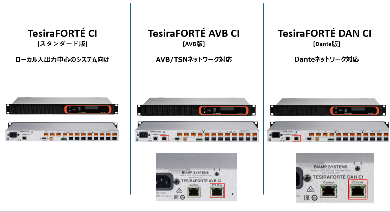 | AVB(Audio Video Bridging)版 | TesiraFORTÉ AVB AI | TesiraFORTÉ AVB CI | TesiraFORTÉ AVB VT | Tesira FORTÉ AVB VT4 |