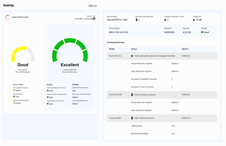 TesiraFORTÉ X には Biamp Launch 機能があり、ハードウェアの検出・設定・チューニングをワンタッチで行います。誰でも短時間で高品質な音響環境を構築できます。また、最適化が終了すると、音響性能の結果を分かりやすくまとめたレポートカード(上記画像)を自動生成。最適化前後の音響特性の比較や、導入されたBiampハードウェア一覧を確認でき、PDF出力やプリントアウトも可能です。