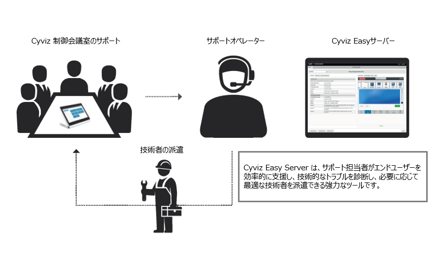 Cyviz Easy サーバー は、Cyviz 製品に限定されることなく、ディスプレイや他社製の AV 機器を含むシステム全体を一元的に管理・監視できるようにします。メーカに依存しない柔軟性により、効率的で実用的なリモートサポート環境を実現します。
