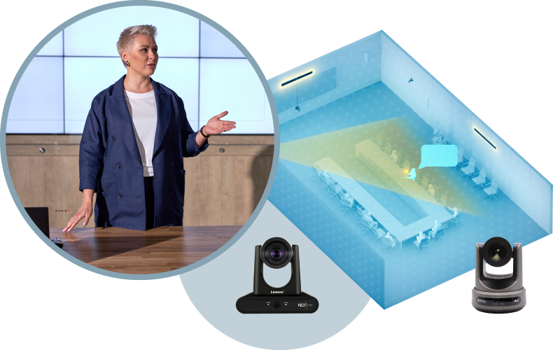 これらのカメラと組み合わせることで、発言者を自動で追跡するカメラトラッキングやカメラ切り替えを実現します。
