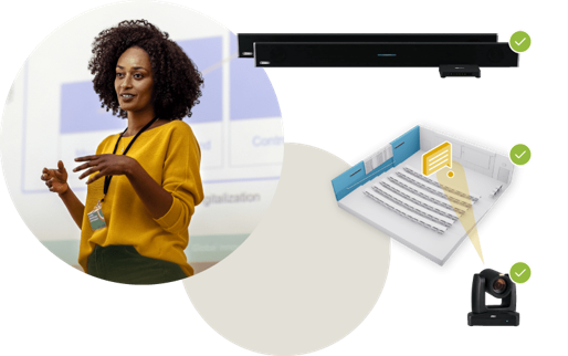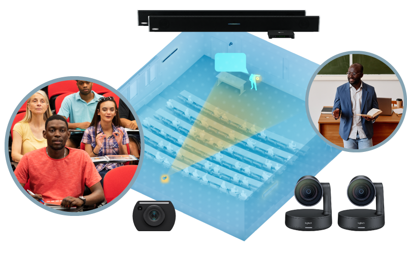 ハイブリッド授業:講師が話している場合も、学生が質問した場合も、遠隔からの参加者は常に重要なシーンを逃すことなく見ることができます。